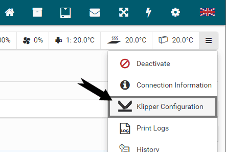 After you have finished the basic installation you will be redirected to a Klipper configuration editor. Here you can configure Klipper and compile the Micro-Controller firmware. See more on that below.