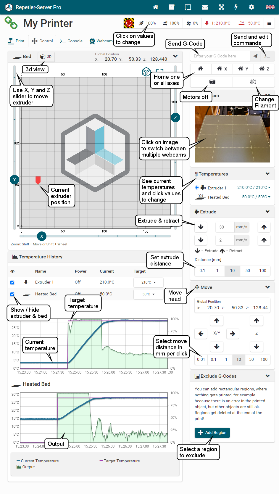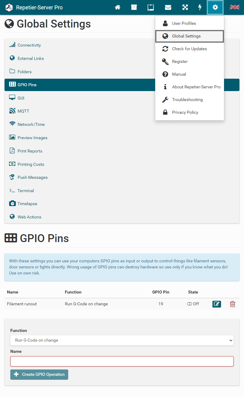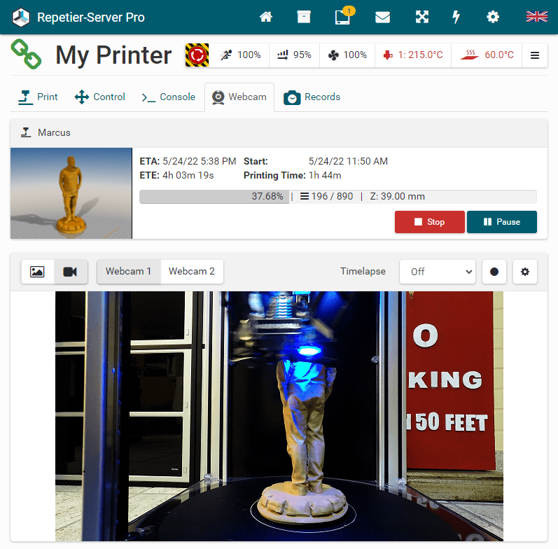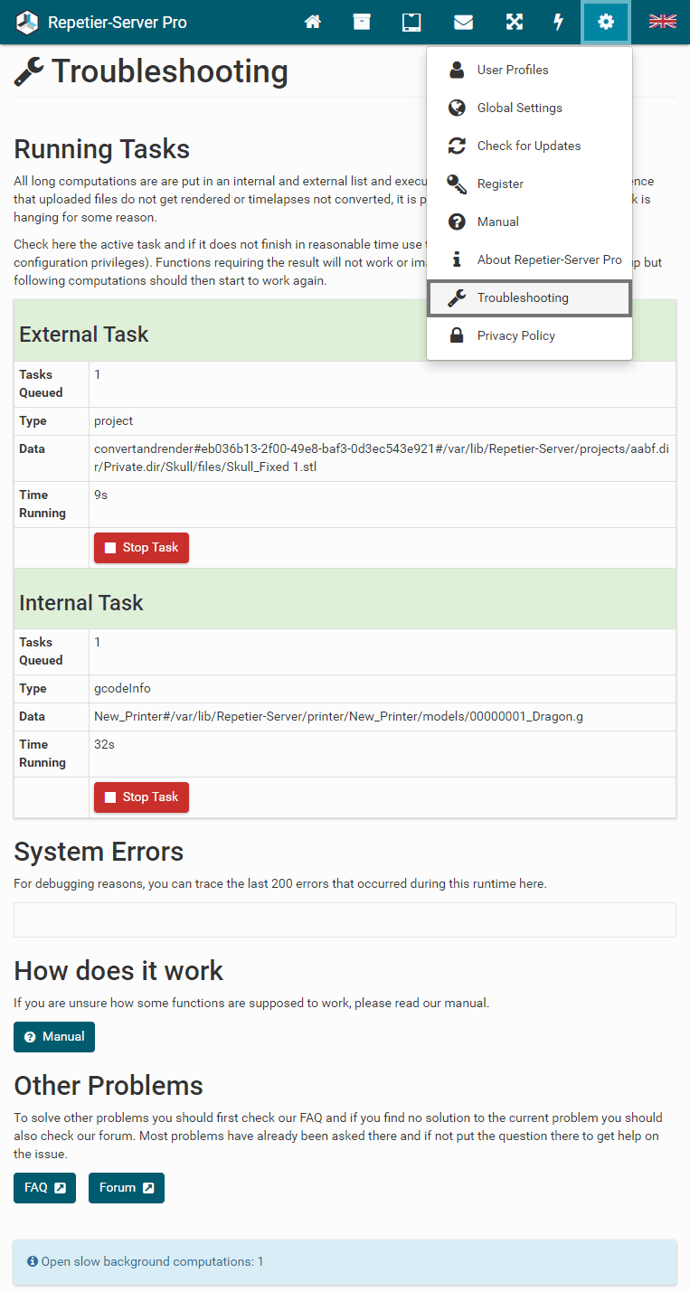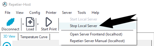 To start and stop Repetier-Server Pro, just enter Start Server or Stop