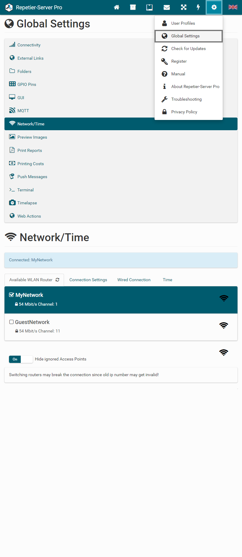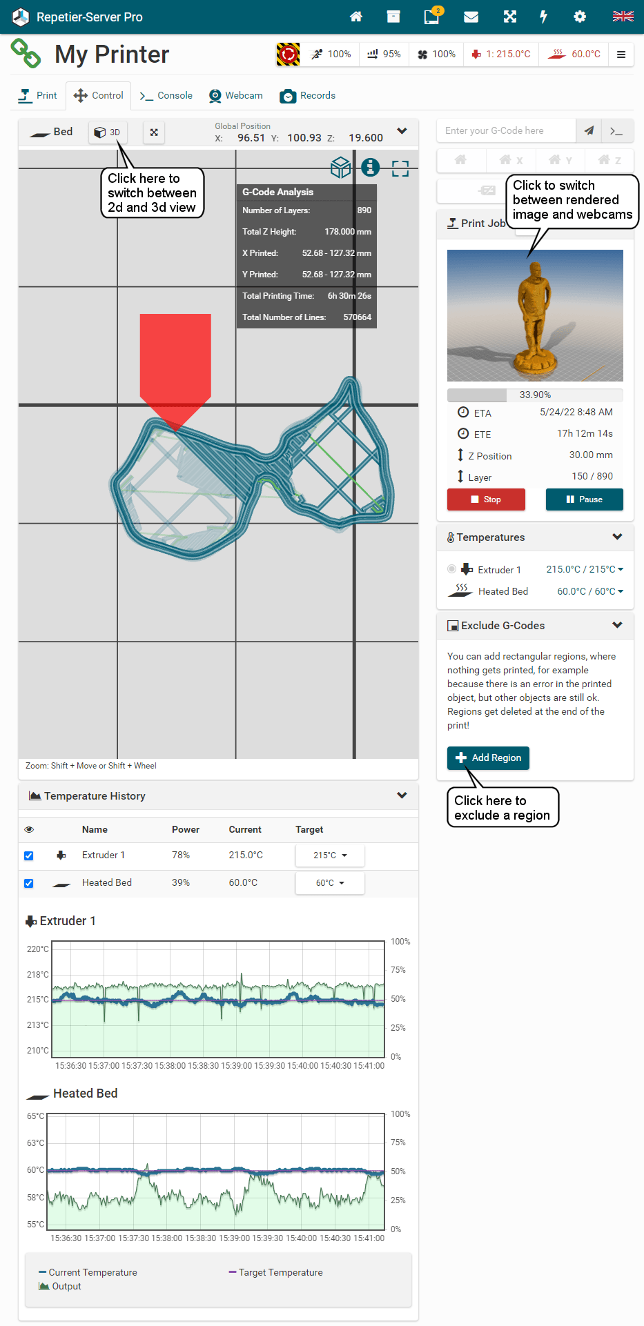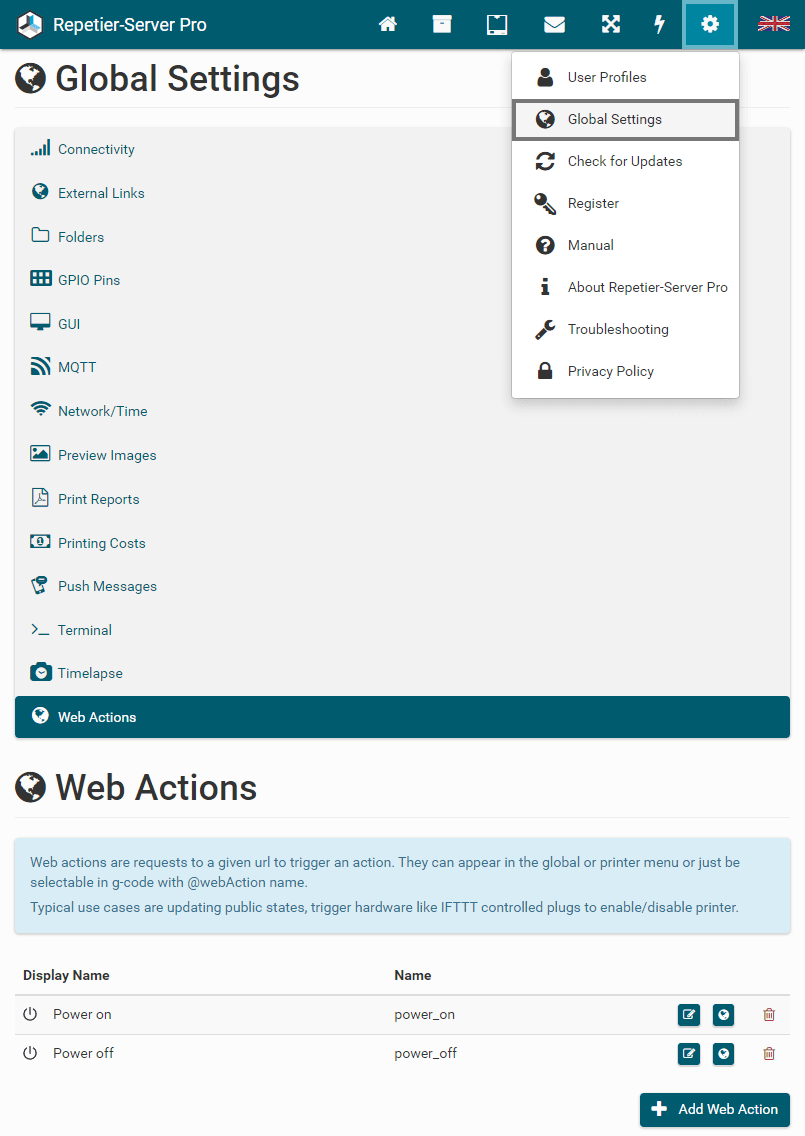 To start and stop Repetier-Server Pro, just enter Start Server or Stop