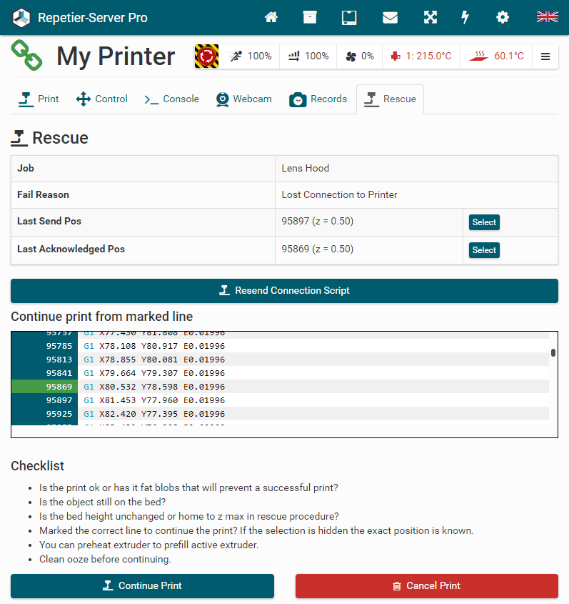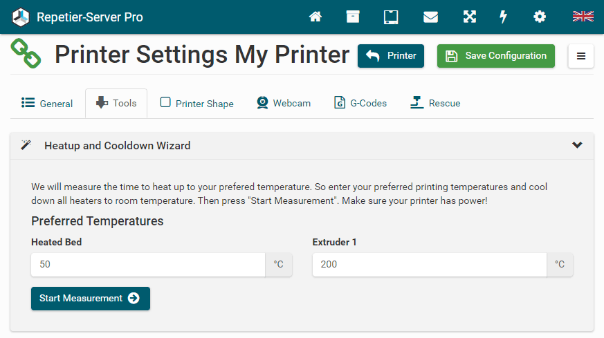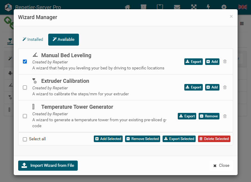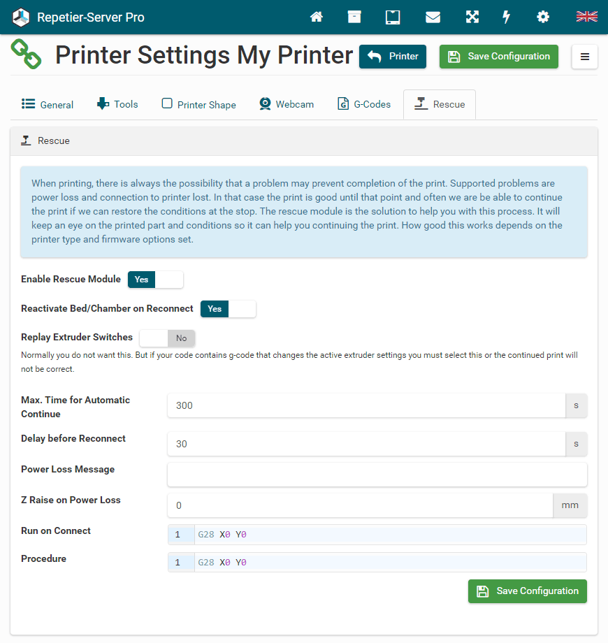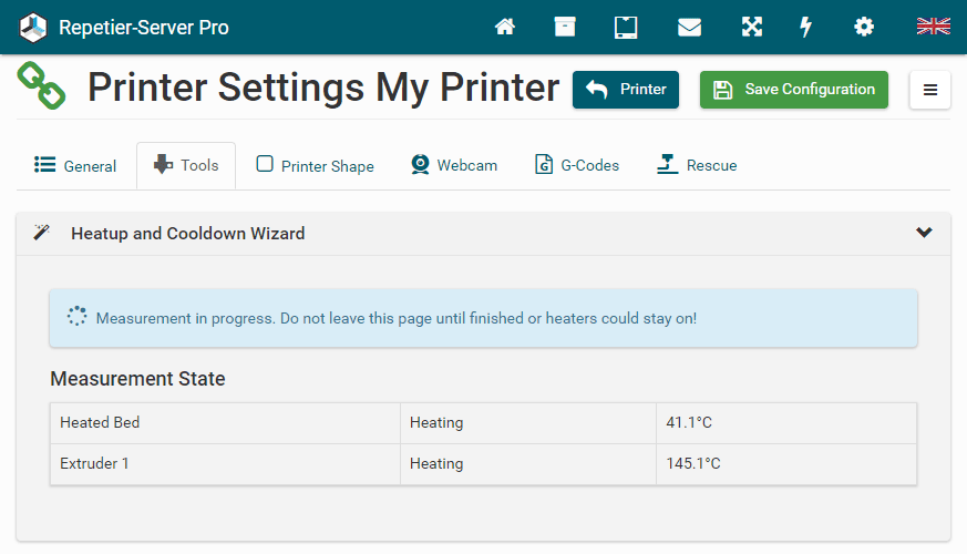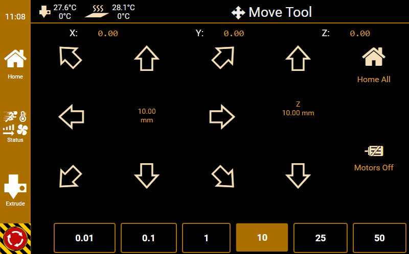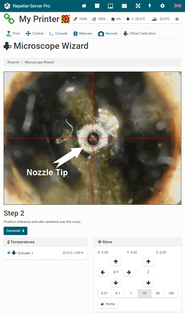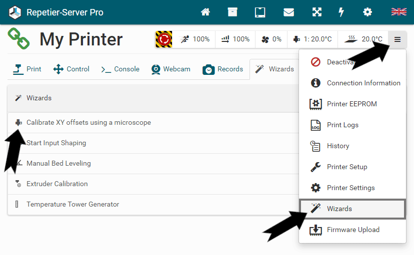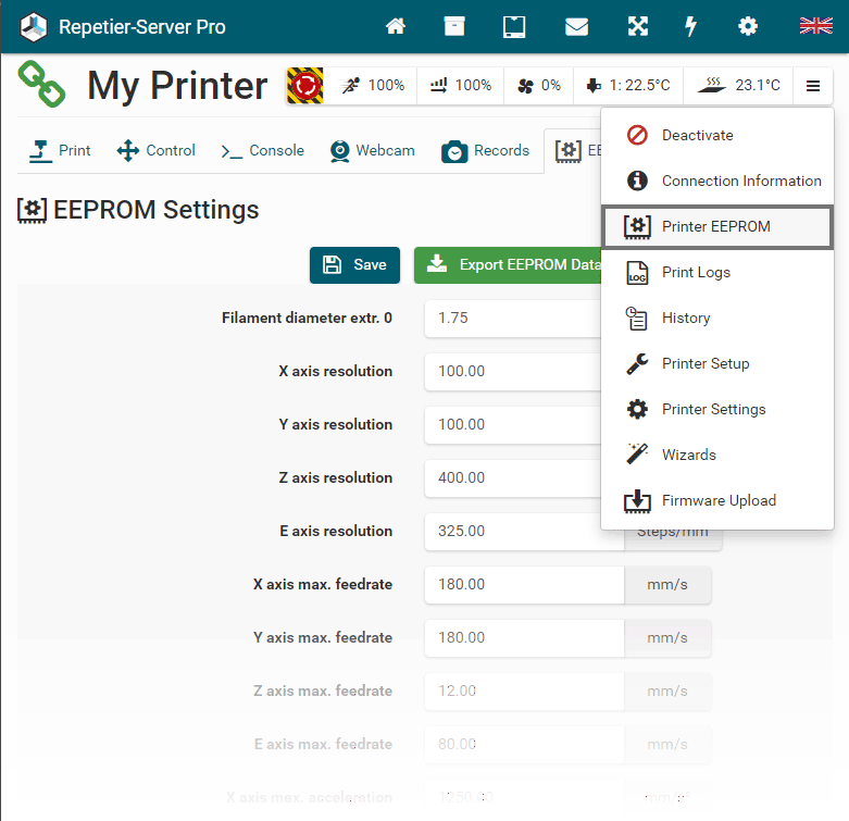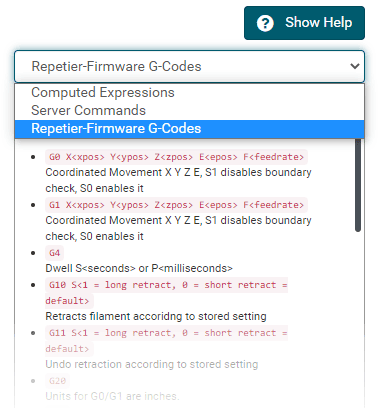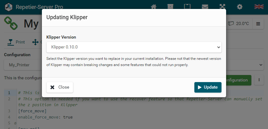G0 X<xpos> Y<ypos> Z<zpos> E<epos> F<feedrate>G1 X<xpos> Y<ypos> Z<zpos> E<epos> F<feedrate>G4G10 S<1 = long retract, 0 = short retract = default>G11 S<1 = long retract, 0 = short retract = default>G20G21G28G29 S<0..2>G30 P<0..3>G31G32 S<0..2> P<0..1>G90G91G92G131G132G133G134 Px Sx ZxG201 P<motorId> X<pos>G202 P<motorId> X<setpos>G203 P<motorId>G204 P<motorId> S<0/1>M104M105M106M107M109M114M3M4M5M20M21M22M23M24M25M26M27M28M29M30 <filename>M32 <dirname>M42 P<pin number> S<value 0..255>M80M81M82M83M84M85M92M99 S<delayInSec> X0 Y0 Z0M104 S<temp> T<extruder> P1 F1M105 X0M112M115M116M117 <message>M119M140 S<temp> F1M163 S<extruderNum> P<weight>M164 S<virtNum> P<0 = dont store eeprom,1 = store to eeprom>M190M200 T<extruder> D<diameter>M201M202M203M204M205M206M207 X<XY jerk> Z<Z Jerk> E<ExtruderJerk>M209 S<0/1>M220 S<Feedrate multiplier in percent>M221 S<Extrusion flow multiplier in percent>M226 P<pin> S<state 0/1>M231 S<OPS_MODE> X<Min_Distance> Y<Retract> Z<Backlash> F<ReatrctMove>M232M233 X<AdvanceK> Y<AdvanceL>M251M280 S<mode>M281M300 S<Frequency> P<DurationMillis>M302 S<0 or 1>M303 P<extruder/bed> S<printTemerature> X0M320M321M322M323 S0/S1M340 P<servoId> S<pulseInUS>M350 S<mstepsAll> X<mstepsX> Y<mstepsY> Z<mstepsZ> E<mstepsE0> P<mstespE1>M355 S<0/1>M360M400M401M402M408 S<0-5>M450M451M452M453M460 X<minTemp> Y<maxTemp>M500M501M502M513M600M601 S<1/0>M602 S<1/0> P<1/0>M603M604 X<slowdownSteps> Y<errorSteps> Z<slowdownTo> T<extruderId>M908 P<<address> S<value>M999Repetier-Server Pro supports the guided installation of the firmware Klipper on your devices. To install Klipper, select the Klipper firmware during printer creation. The button Install appears. When you click this button, a menu appears that installs all dependencies and installs Klipper properly. Note that the default path of the installation is not /home/pi/klipper as in a normal installation but /opt/klipper/SLUG and this directory belongs to the user "repetierserver" and is therefore not accessible with the user pi.