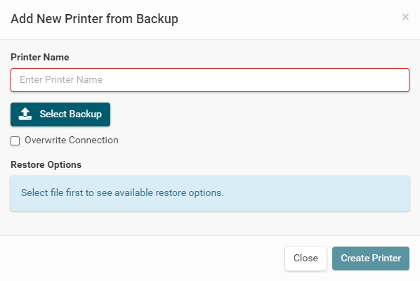 Backup. Enter a printer name, select the backup file.